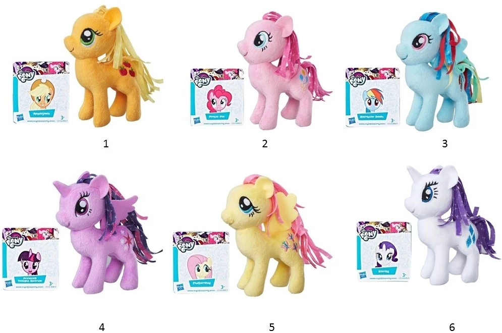 Pony Small Plush σε διάφορα σχέδια Δημιουργείστε τις δικές σας ιστορίες ή ιστορίες από την τηλεοπτική σειρά My Little Pony Η Φιλία είναι Μαγική με αυτά τα μικρά πόνι! Η χαίτη της είναι στολισμένη με ζωγραφιές. Διατίθεται σε 6 σχέδια: Twilight Sparkle, Rainbow Dash, Pinkie Pie, Rarity, Fluttershy, Applejack